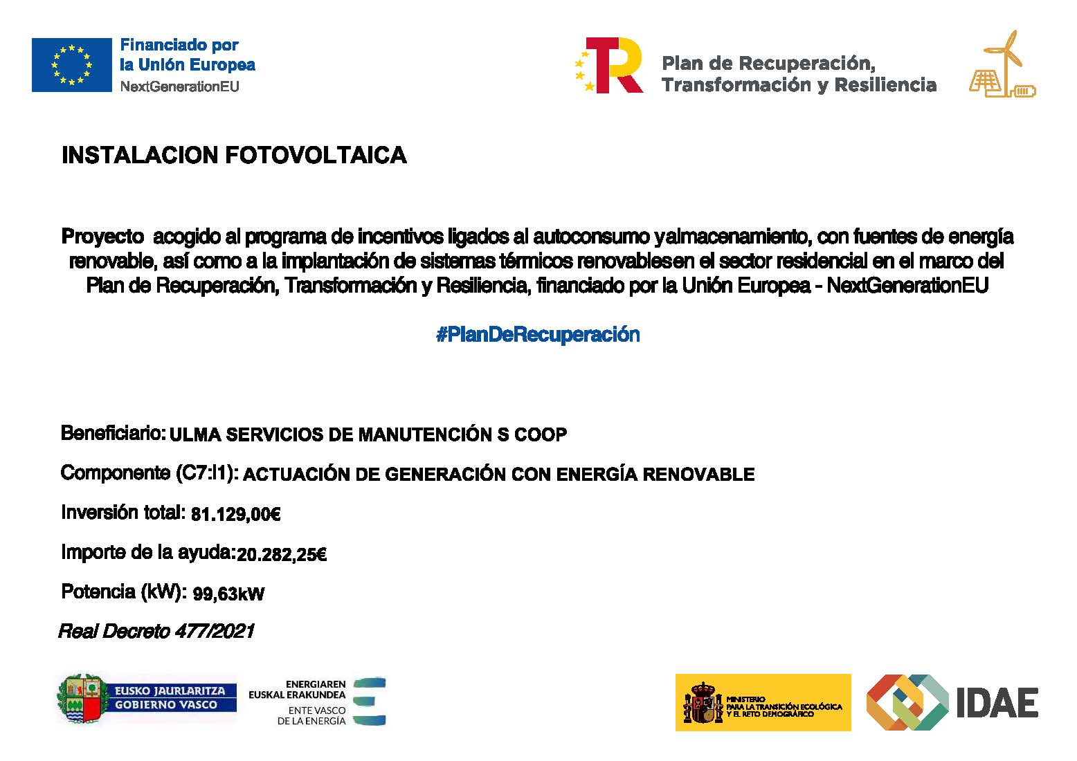 Anuncio oficial del apoyo de la Unión Europea a ULMA Servicios de Manutención - instalación fotovoltaica